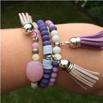 Een set van 3 armbandjes van acrylkralen, houten kralen en fimo kralen afgewerkt met tassels.