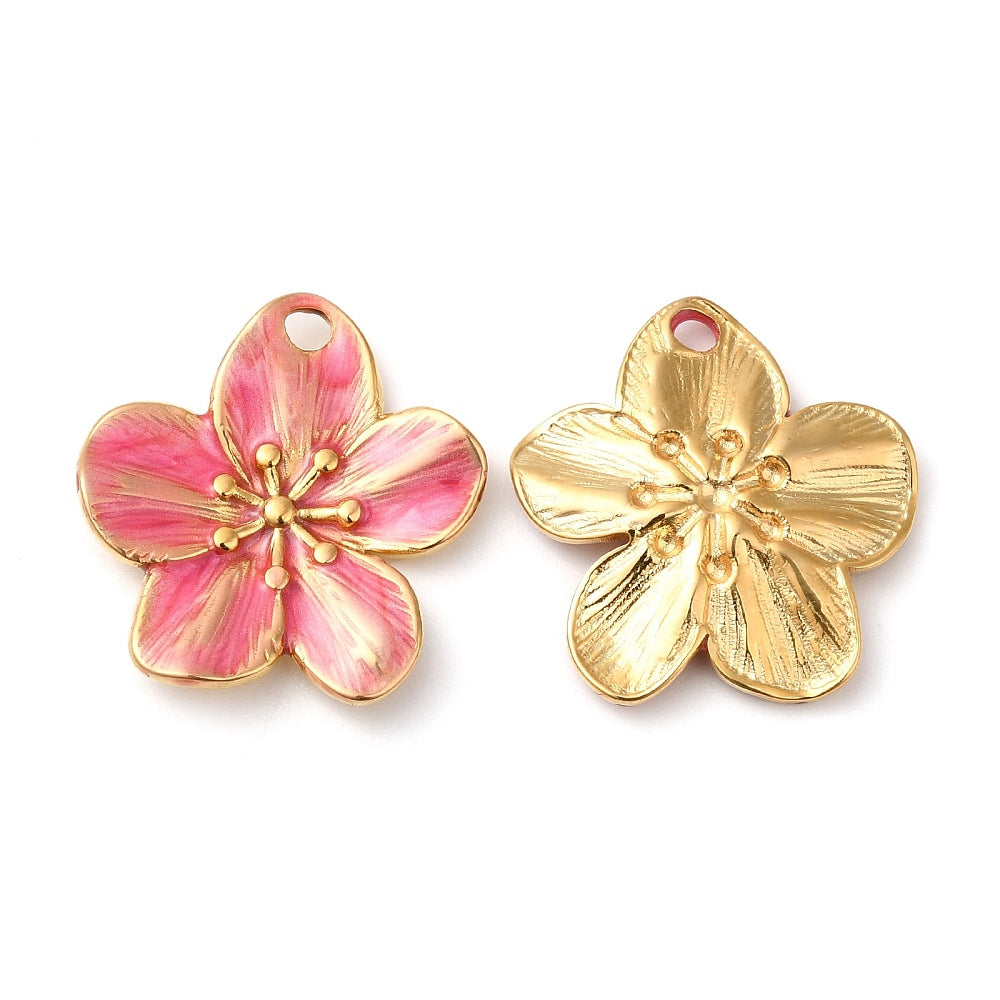 Bedel RVS enamel Bloem deep pink 18K Goud