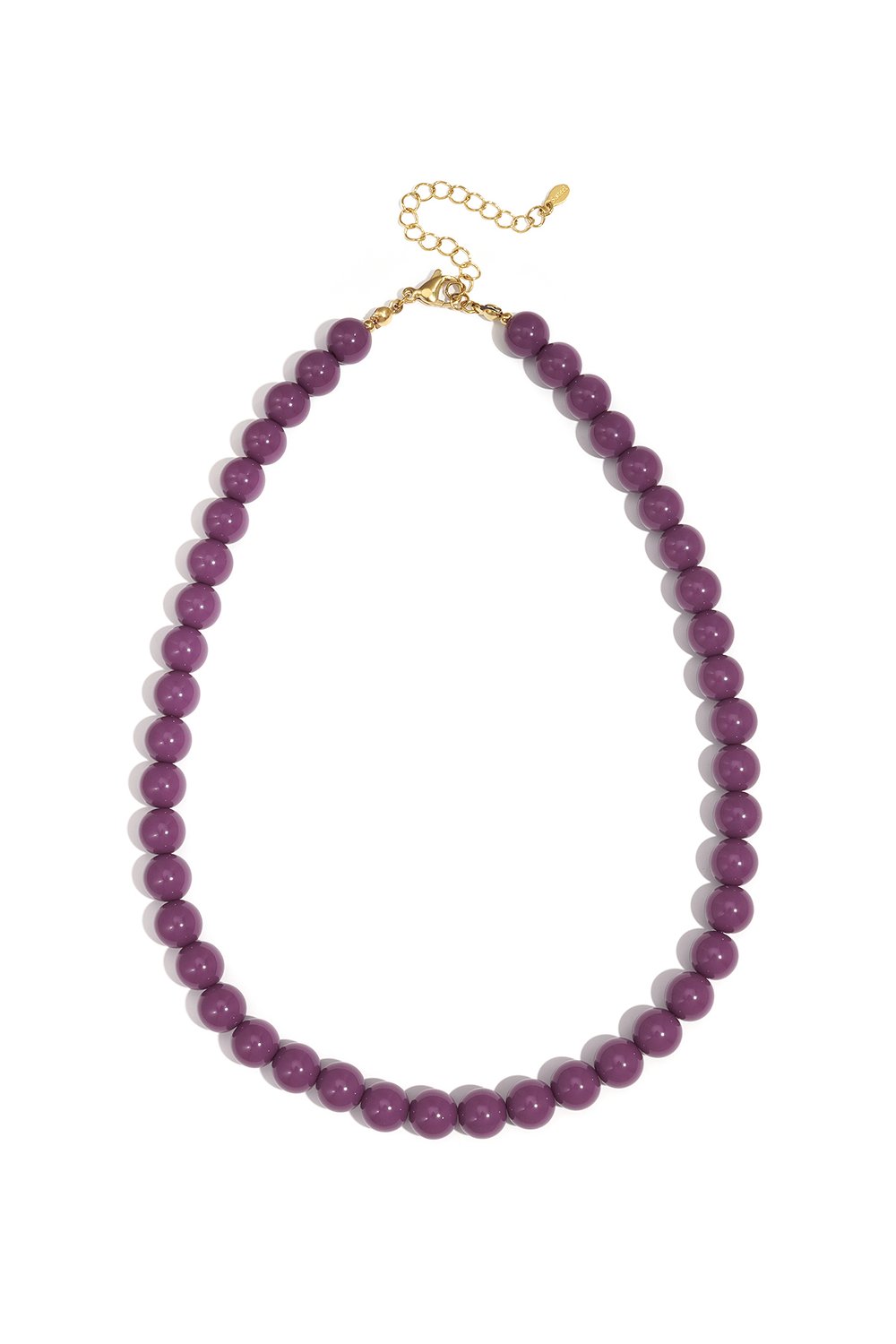 De trend van nu! Een kralen ketting van prachtige paarse kleur, 10mm kralen met een goudkleurige sluiting. Doordat de ketting gemaakt is van RVS, verkleurt deze niet! De ketting is 42 cm lang en 7 cm verstelbaar.