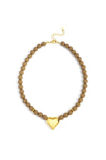 De trend van nu! Een kralen ketting met grote ronde kralen in de kleur bruin, een groot rvs metalen hart en details in goudkleur. Doordat de ketting gemaakt is van RVS, verkleurt deze niet! De ketting is 40 cm lang en 5 cm verstelbaar.