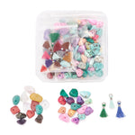 In het pakket zitten 30 gram (circa 95 stuks) natuursteen chip kralen met een afmeting van 5-8mm en een opening van 1mm. Tevens bevat het pakket 30 gram (circa 95 stuks) turquoise (synthetisch) kralen, eveneens met een afmeting van 5-8mm en een opening van 1mm. Naast de kralen bevat dit pakket ook 20 kwastjes, die mooi combineren met de natuurstenen. De kwartjes hebben een afmeting van 10-15x3-4mm en een opening (oogje) van 2mm. Dit alles samen komt in een handige opbergbox van 64x63x20mm.