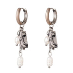 De roestvrijstalen oorbellen hebben een langere ketting met zoetwaterparels als bedel.